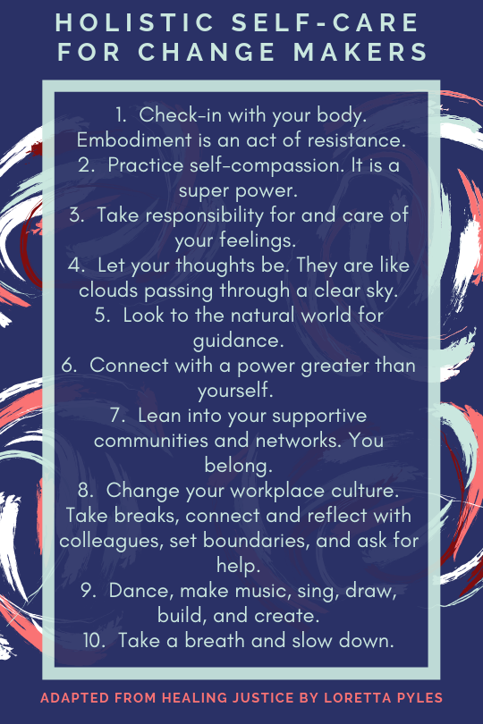 Each semester, I spend more and more time talking with my stressed out, overworked, underpaid undergraduate students about care. Over time, this has extended into taking a minute or two to breathe and meditate at the beginning of class, reminding the students that there are no wrong ways to breathe. Sometimes we laugh. We feel embarrassed. I worry I might be fired for doing this. But as Loretta Pyles points out, it’s okay to feel. It’s okay to look inward as we look outward, seeing ourselves as a part of a much, much larger whole. There are only a few social welfare / social movement scholars in the country who take a look at the state of our world and practice, in all its glories and blind spots, in the ways Loretta Pyles does. Healing Justice is a revelation, pointing to social work practice at its best, integrating public and private, internal and external selves.